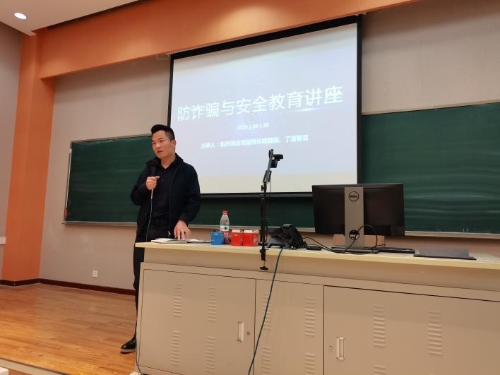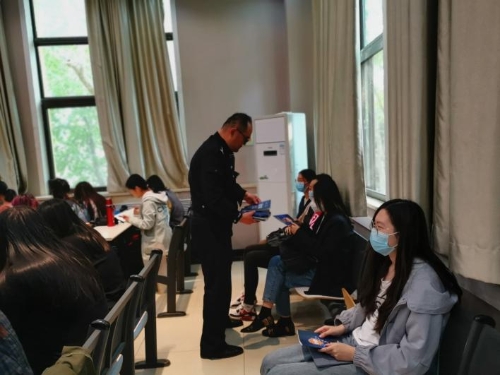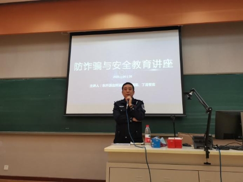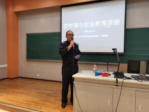 2021年4月26日,保卫处邀请海淀分局东升派出所陈国震副所长、丁涛警官来校为外国语学部高级翻译学院师生举办校园防诈骗与安全教育专题讲座,高级翻译学院70余名学生现场聆听讲座,该院学生干部踊跃参与。两位警官在现场倾囊传授防诈骗与安全教育知识,精彩授课引起热烈反响,防诈骗与安全教育取得显著效果。