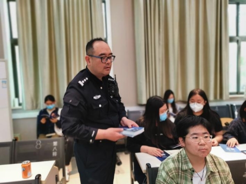 在讲座中,陈国震副所长以丰富的从警经历娓娓道来,从犯罪分子惯用的“校园贷款诈骗”、“冒充公检法诈骗”、“兼职刷单返利诈骗”、“网上交友诈骗”、“冒充客服诈骗”等方面进行提示,并辅以真实案例进行深度解析。丁涛警官主要讲解了社区防诈骗方面的知识,以及遇到电信诈骗之后的应对策略,生动的案例吸引着在场师生认真“听讲”,风趣的语言始终活跃着“课堂”氛围,两位警官为师生呈现了一堂精彩的安全教育讲座。在讲座现场,保卫处和两位警官向学生发放了《防范电信网络诈骗手册》,并引导学生下载安装“全民反诈”手机应用。最后,保卫处在避免外卖丢失、校园贷的危害等方面作了说明和提示。一个小时的时间很快过去,讲座结束时同学们带着“安全知识”恋恋不舍地离开教室。本次安全教育活动进一步提升了师生的安全意识,为“平安北语”建设凝聚了新的力量。