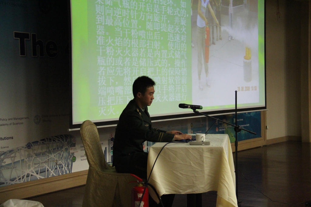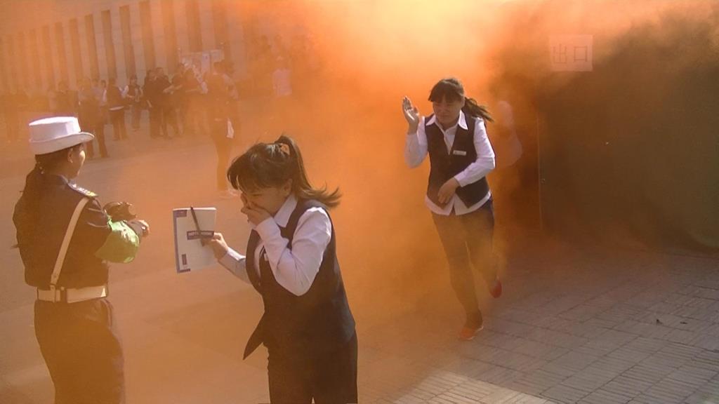 随后,消防支队陈晨副中队长为大家做了消防安全知识的培训讲座。他首先通过北京市发生过的几次因违规用电、违规操作引发火灾的案例,用血的教训告诫我们大家要珍爱生命,一旦遇事不能慌张,要保持冷静,更要掌握正确的逃生方法;其次,陈晨副中队长讲解了各种灭火设施的使用方法,并做了消防灭火器材实际使用的培训。最后大家通过帐篷逃生的模拟演练,体验了在火灾发生的实际情况下如何正确逃生的方法。