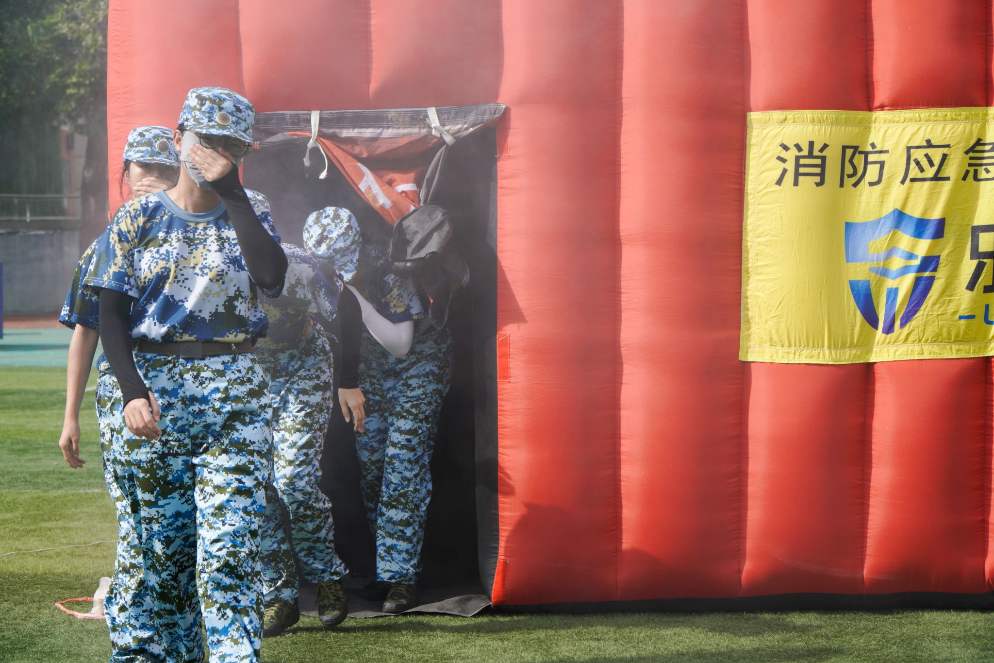 随后,同学们逐一踏入逃生帐篷,在专业救援人员的指导下,模拟真实火灾场景下的紧急疏散,并顺利逃生至安全区域。