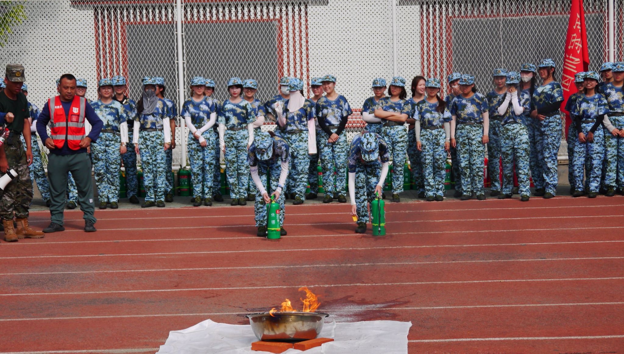 1200余名学生到达操场后,分为两组,每组600人,分别进行消防安全知识培训及灭火器实操、消防帐篷逃生演练。