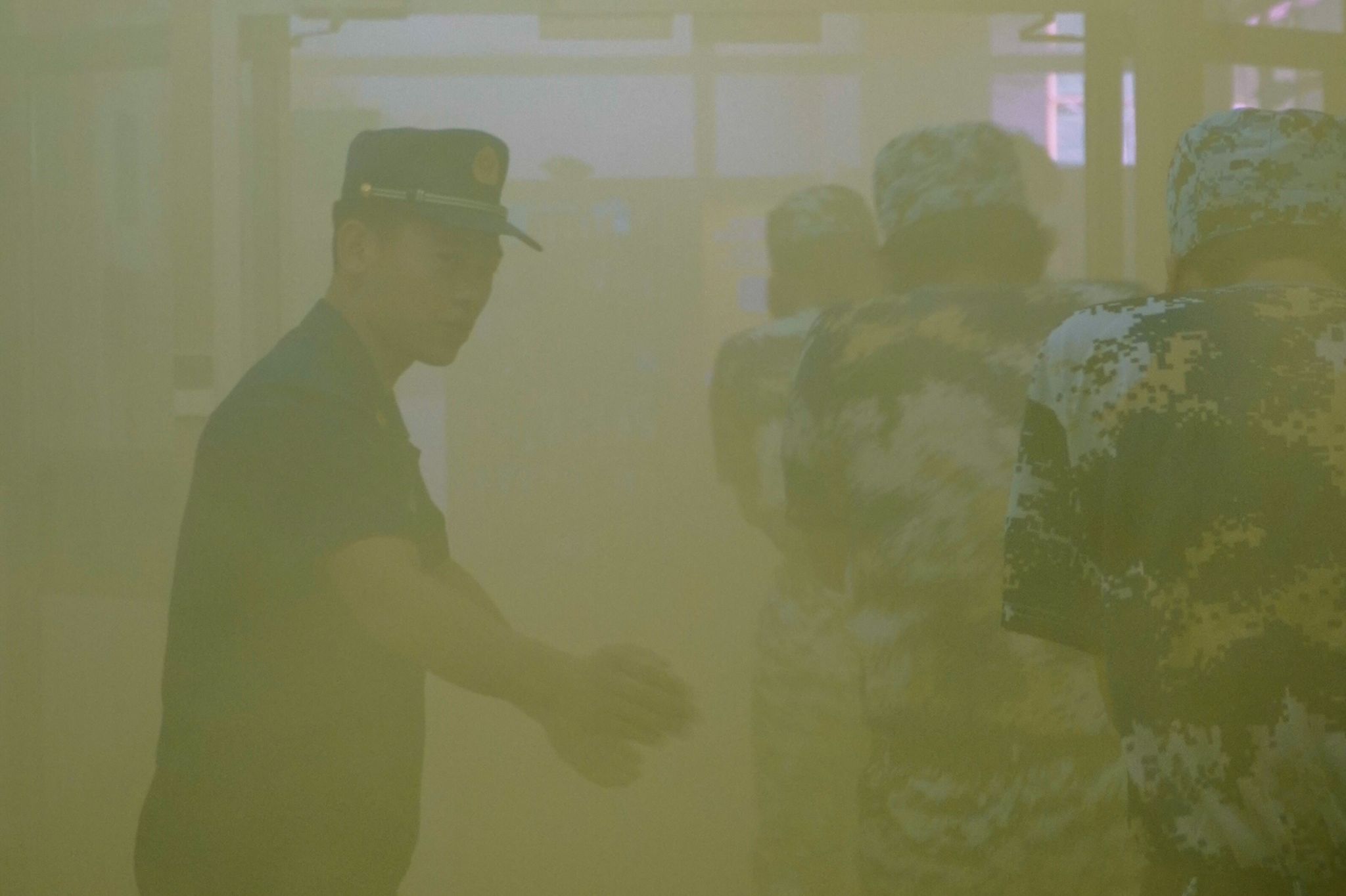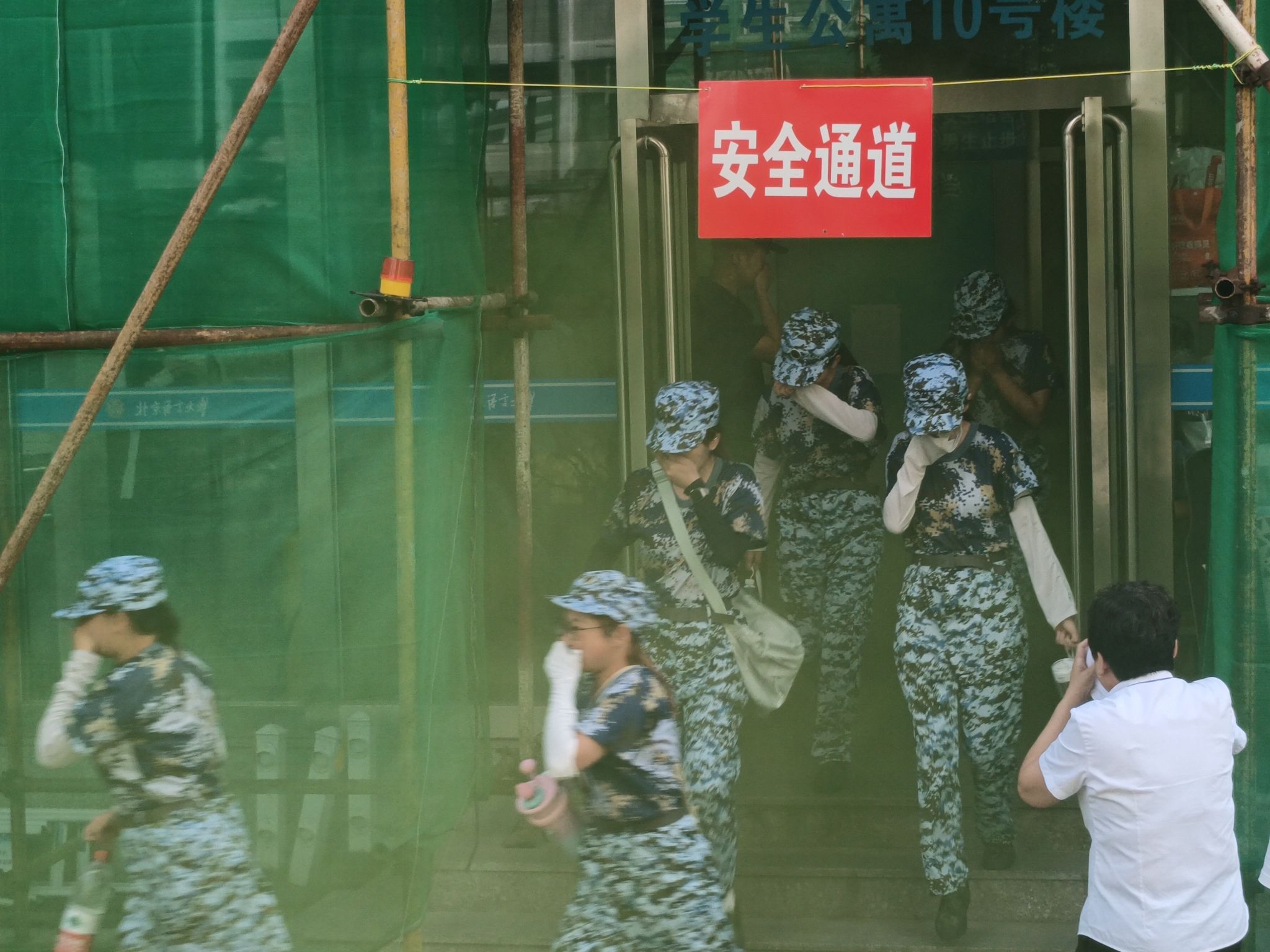烟雾慢慢升起,在工作人员的统筹协调下,学生们捂住口鼻,弯腰前行,迅速从楼内有序疏散至楼外开阔地带,按照规定路线行进至操场指定位置后,教官清点人数。