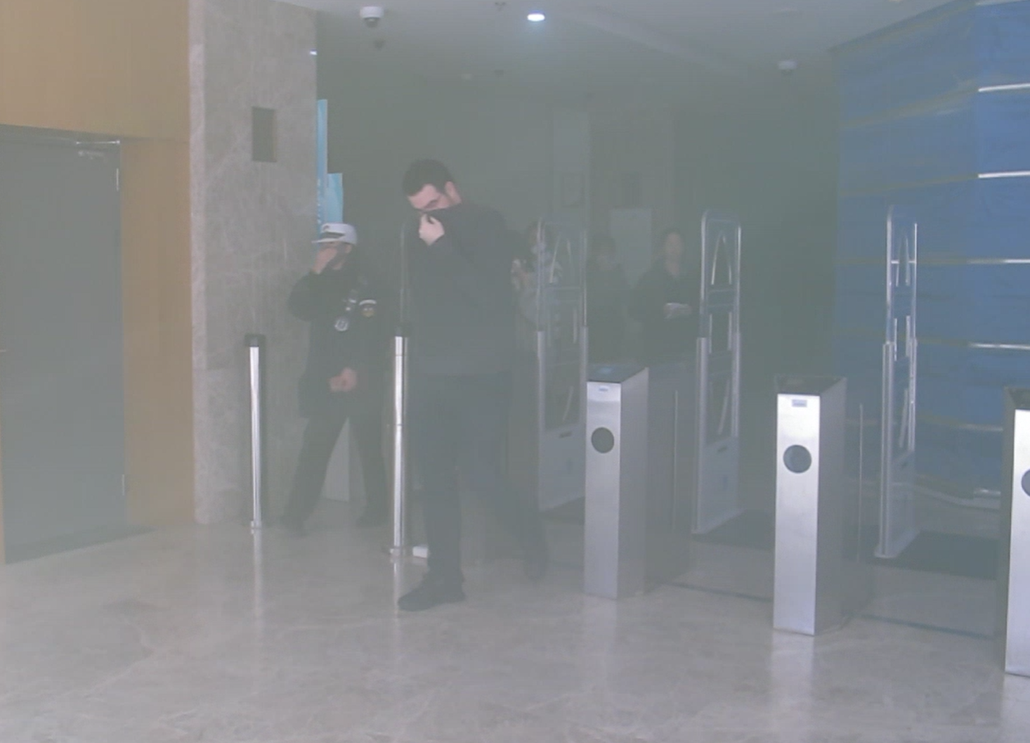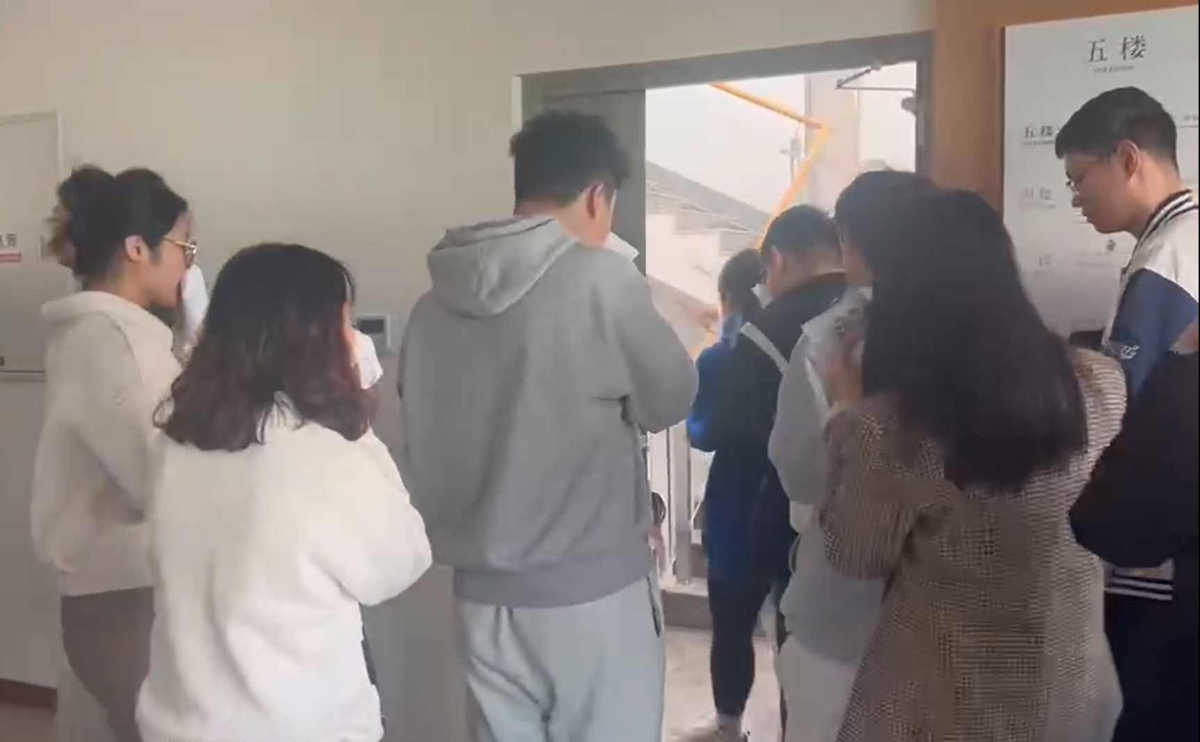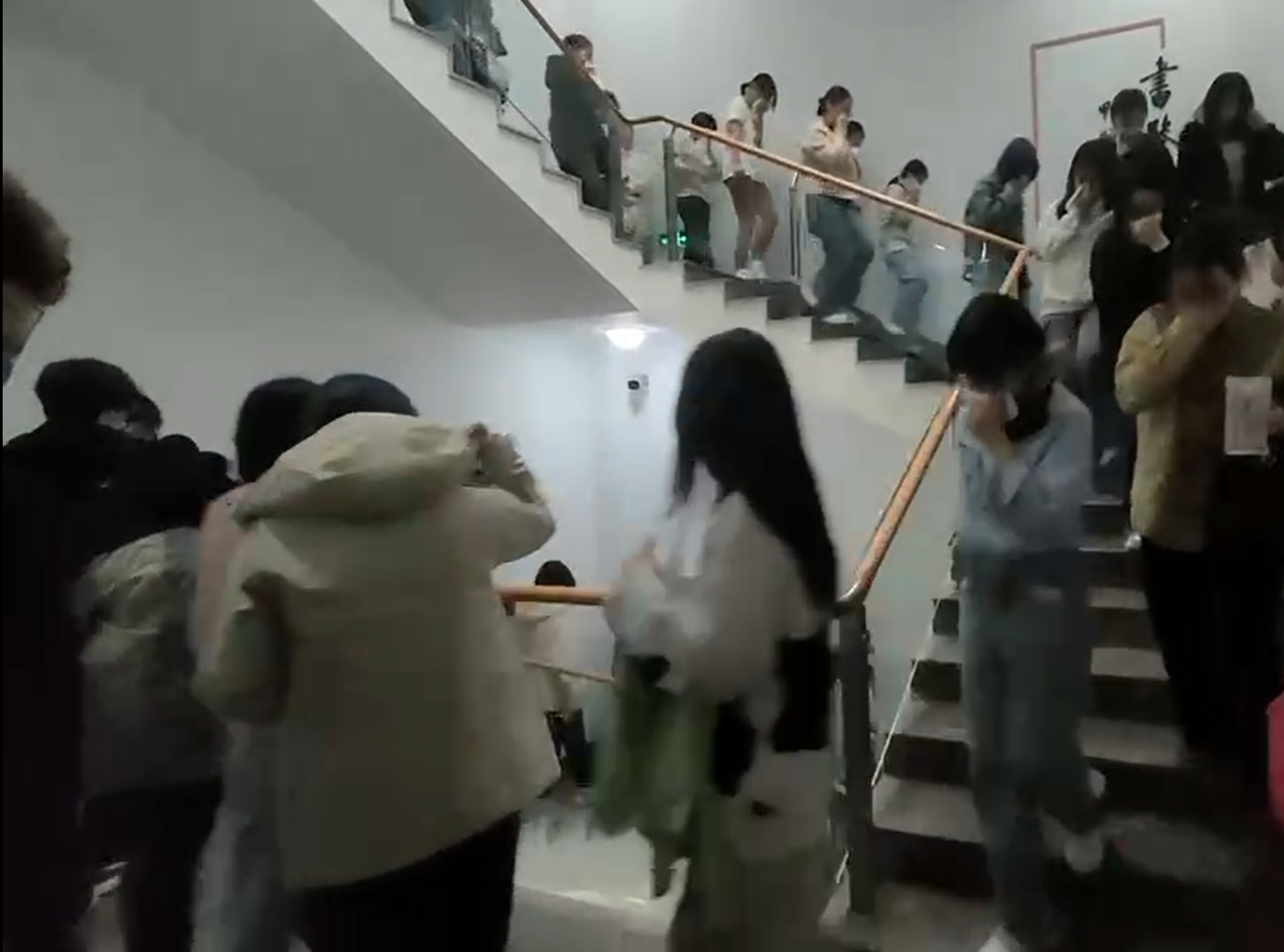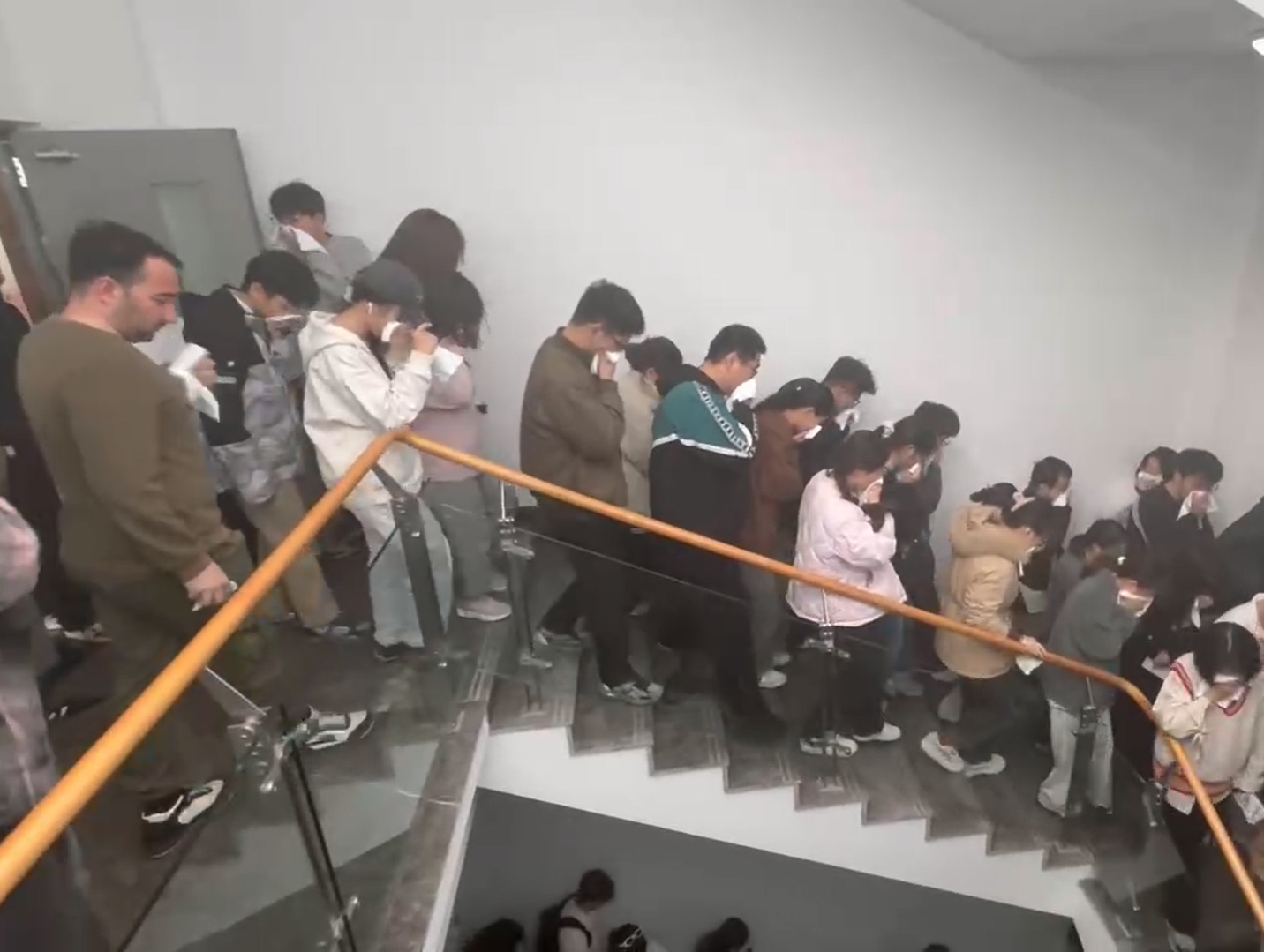 烟雾弥漫警铃响起,在志愿者和馆内管理人员的引导下,同学们捂住口鼻,快速有序地从疏散楼梯疏散至平坦开阔的馆前广场。